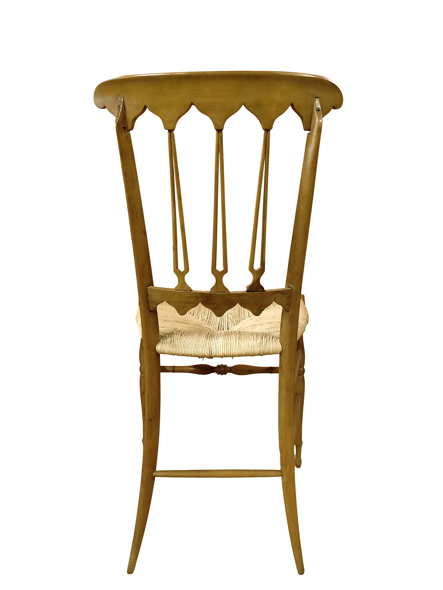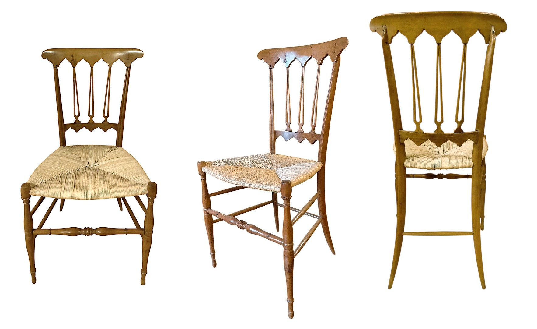Set composto da 3 sedie Chiavari, modello “Spadina”, caratterizzate da linee leggere e slanciate tipiche della tradizione artigianale ligure. Un complemento d’arredo iconico, capace di unire estetica, funzionalità e storia.