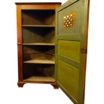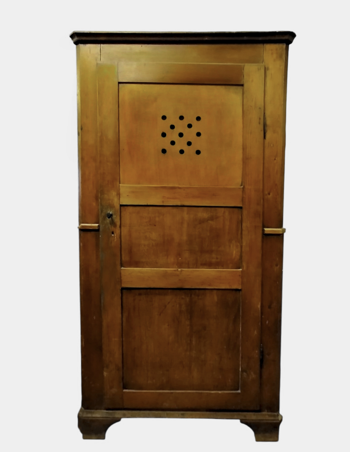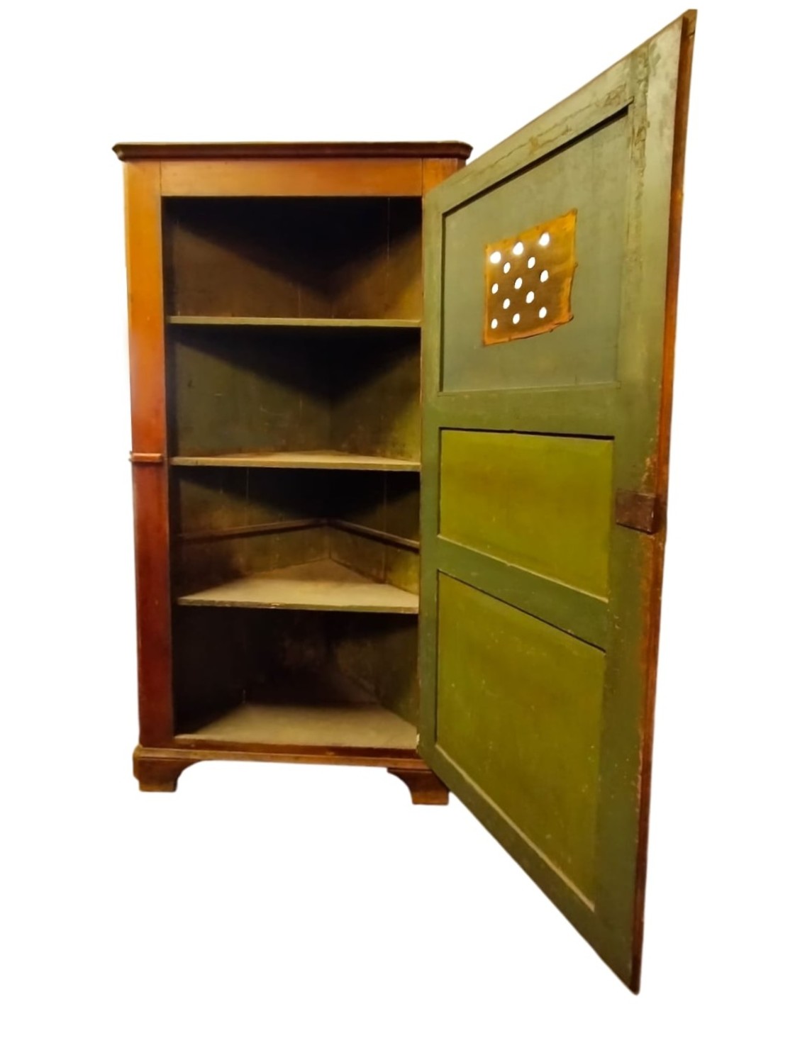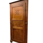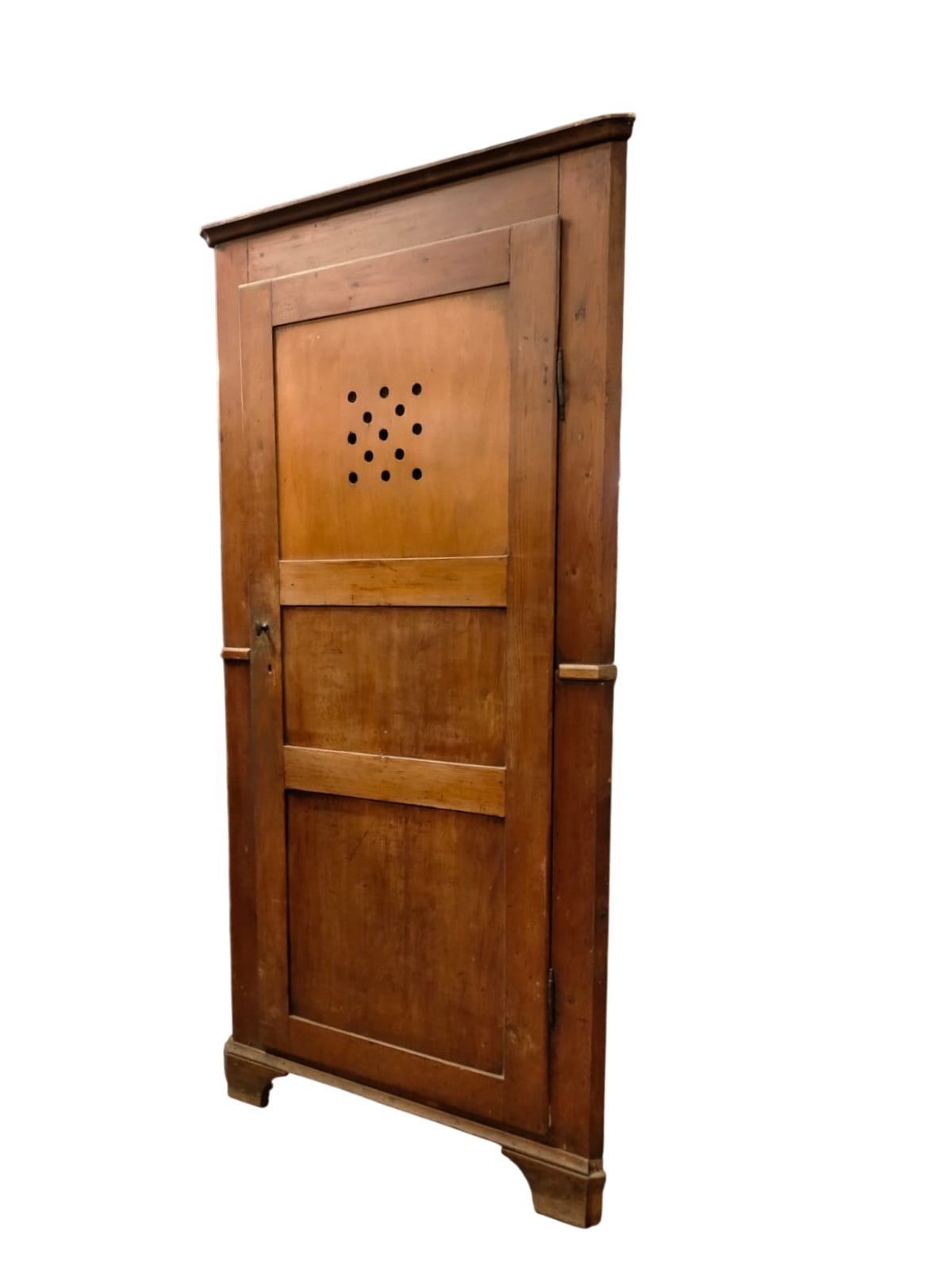Angoliera romagnola della seconda metà dell’Ottocento in abete e tavolo romagnolo anni ’30/’40 in olmo massiccio, due pezzi di valore storico e artigianale, perfettamente abbinabili per stile, materiali ed epoca. Nello sportello superiore l’angoliera ha fori originali per conservare le vivande, caratteristica tipica della tradizione romagnola.