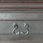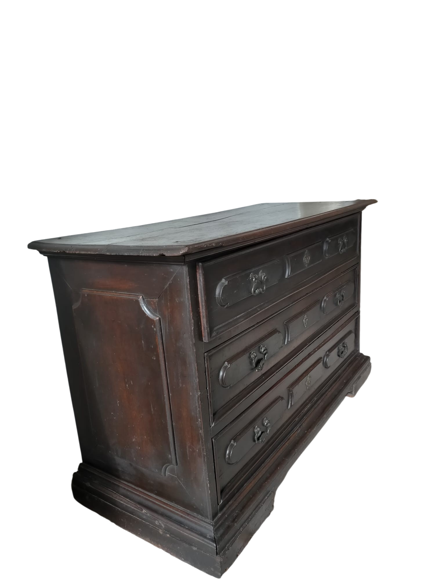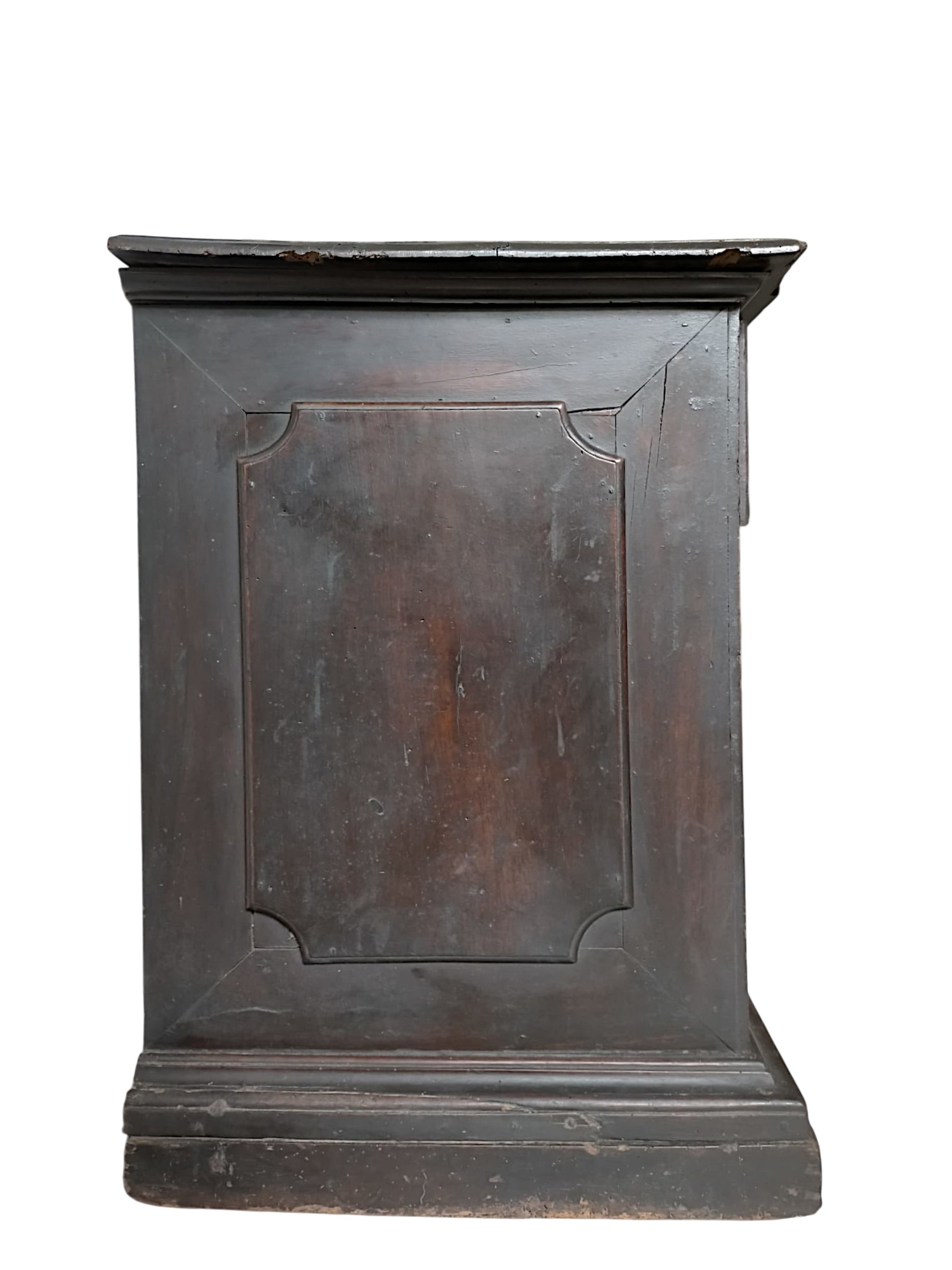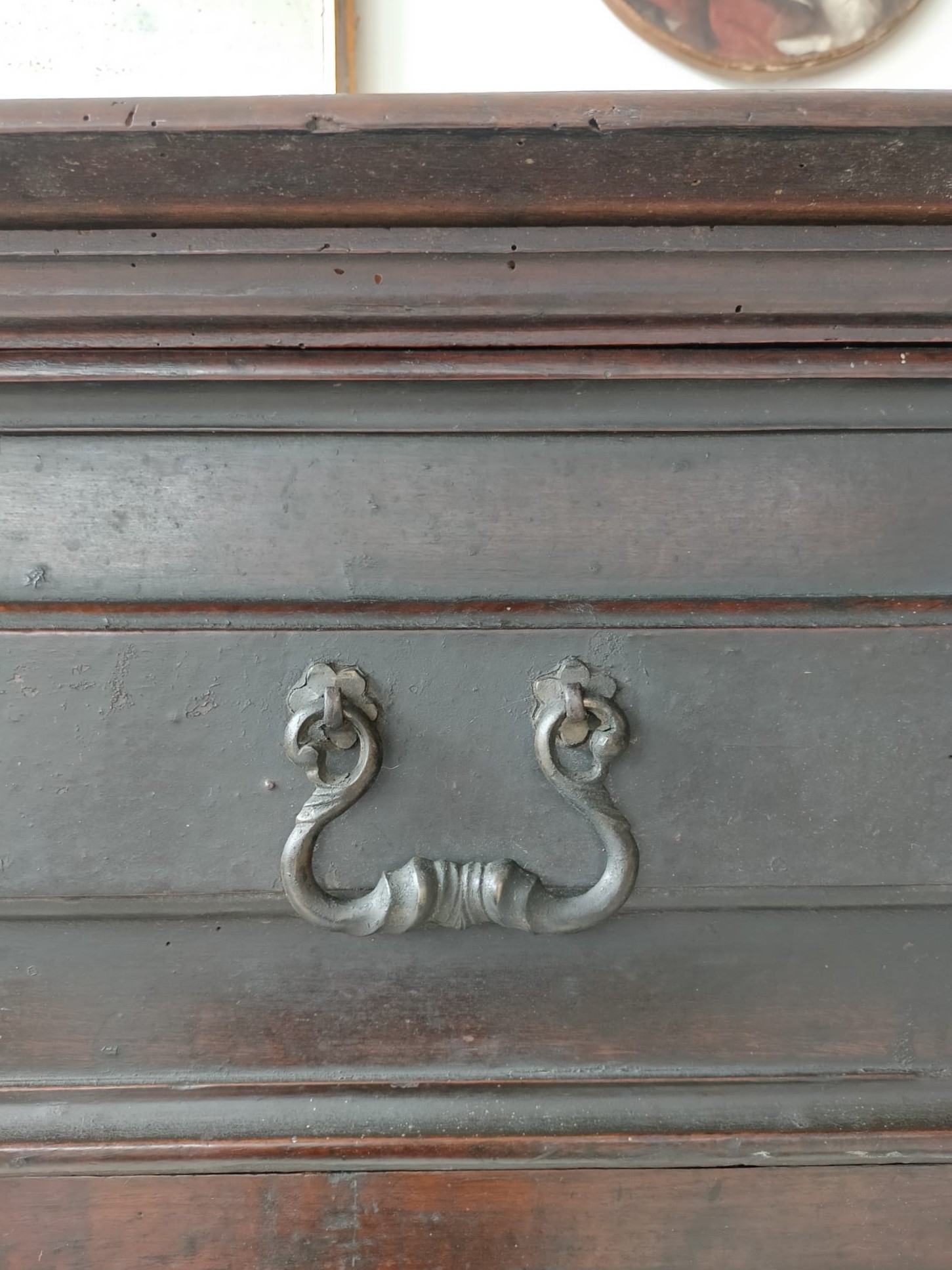 La ferramenta è originale dell’epoca: maniglie, bocchette, serrature e chiodi coevi contribuiscono a mantenere intatta l’autenticità del pezzo. Anche le parti strutturali interne, come schiena e cassetti, sono costruite in legno massello, secondo la tradizione costruttiva del Seicento.