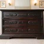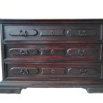 Il fronte è scandito da tre ampi cassetti, impreziositi da lavorazioni a rilievo con formelle lobate e motivi geometrici, interamente realizzati in noce massello di eccellente qualità. Il piano superiore presenta un elegante profilo a “becco di civetta”, una raffinata modanatura che arrotonda lo spigolo, donando armonia e continuità alle linee del mobile.