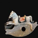 Splendido cavallino a dondolo originale dell’Ottocento, realizzato in cartapesta e legno laccato, un oggetto raro e ricco di fascino d’epoca. La sua lavorazione artigianale e la patina autentica lo rendono un elemento incantevole, capace di aggiungere calore e atmosfera a qualsiasi ambiente.