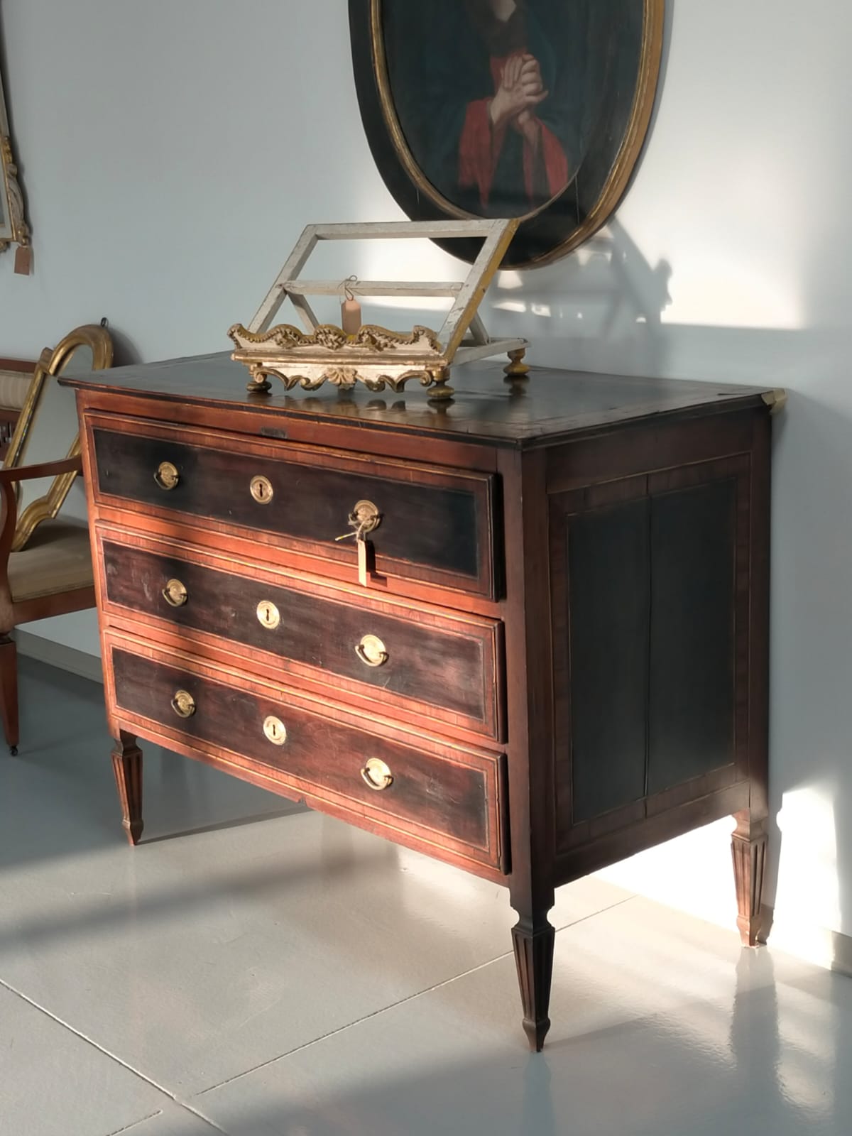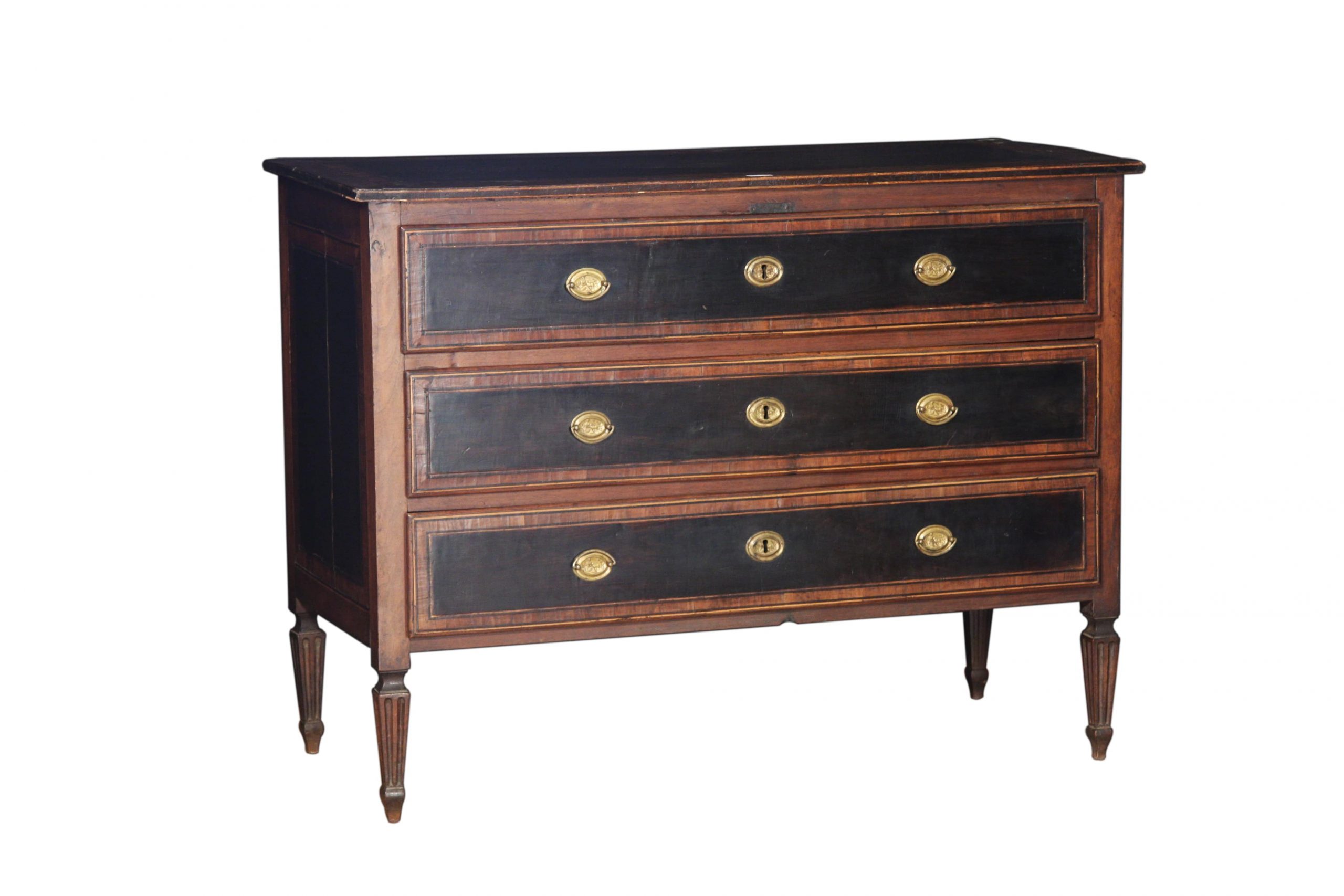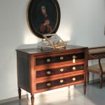 Comò Luigi XVI elegante, lastronato e filettato, di fine 700.