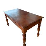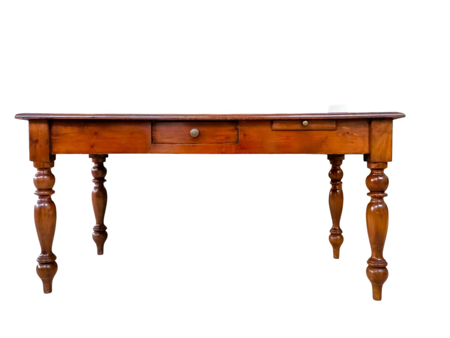 Tavolo scrittoio di solida struttura in abete con eleganti piedi torniti in noce, rifinito a gommalacca e cera per un effetto caldo e luminoso.