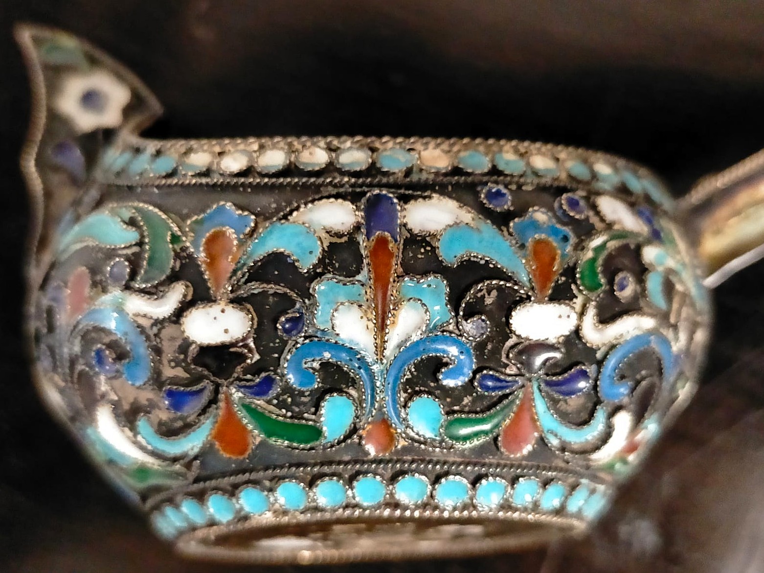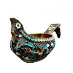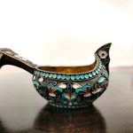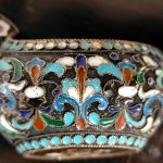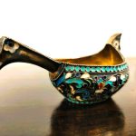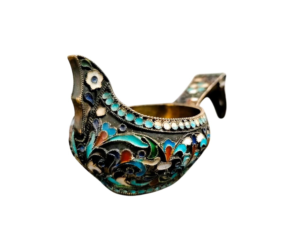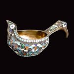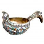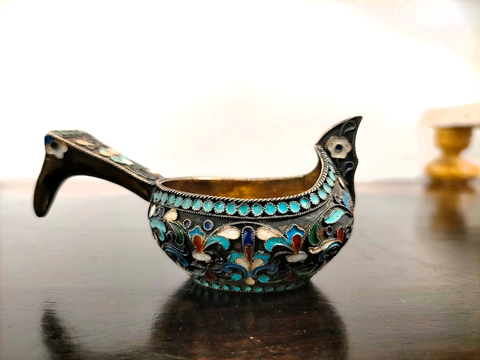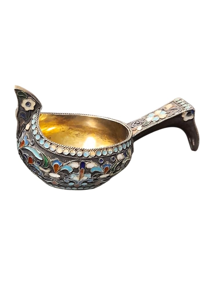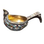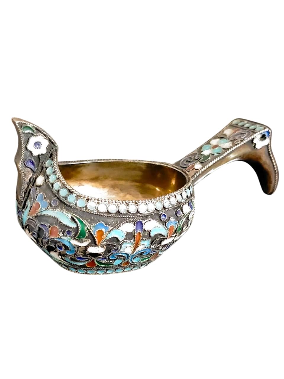 Kovsh russo in argento – Mosca -1898, con motivo a smalto, realizzato con la tecnica dello smalto cloisonné.