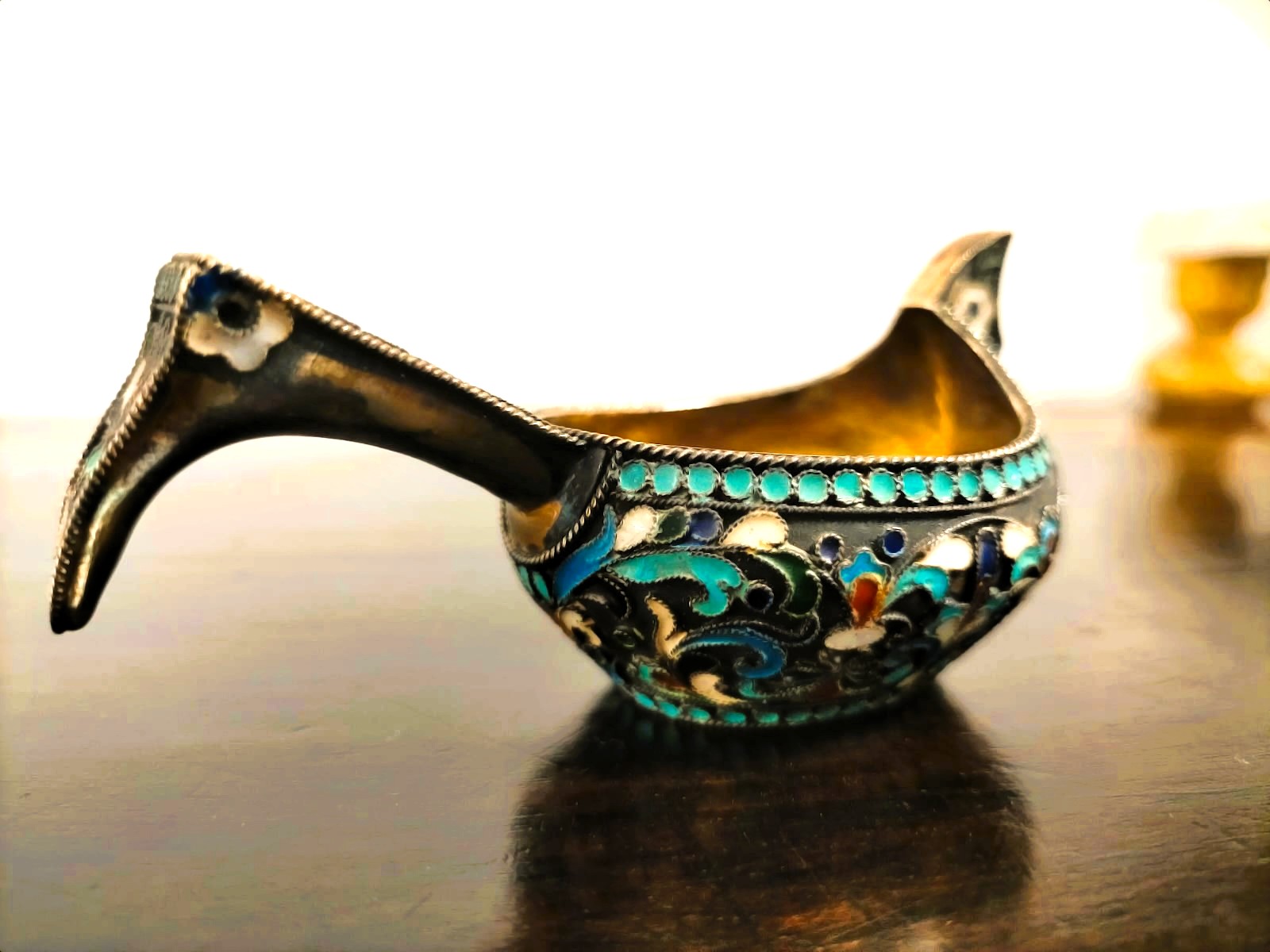 I kovsh russi (o kovshi al plurale) rappresentano antichi e preziosi recipienti tradizionali, simili a mestoli o piccole ciotole, di forma ovale, con un lungo manico e talvolta un beccuccio. In origine servivano per bere bevande come l’idromele; tuttavia, con il tempo si sono trasformati in oggetti d’arte sfarzosi in metallo prezioso (argento, oro) e smalti policromi, come il cloisonné. Oggi sono considerati simboli di status e capolavori dell’artigianato russo, spesso collegati a maestri rinomati come Fabergé.