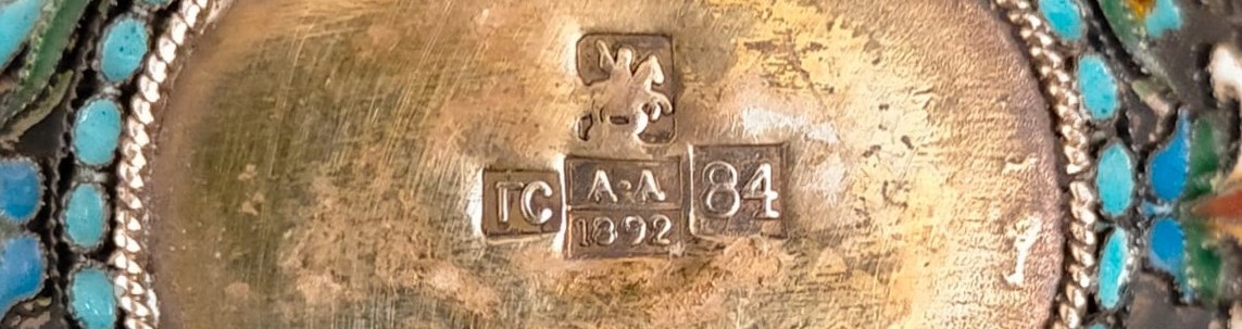 - 84: Indica il titolo dell’argento in zolotnik. “84 zolotnik” equivale a una purezza di 875/1000 (87,5% di argento puro), che era lo standard comune per l’argento russo.