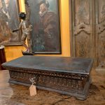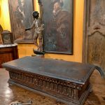 Piccola cassetta porta stendardi del 1600 in noce intagliata.